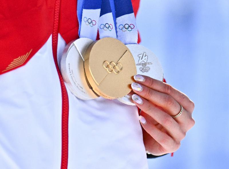 谷爱凌在颁奖仪式后展示自己在本届冬奥会上获得的三枚奖牌。 新华社发